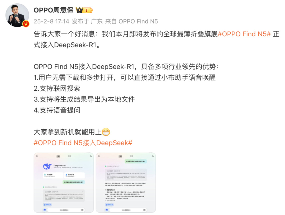 如上图所见,OPPO Find系列居品负责东说念主周意保预报本月行将发布的OPPO Find N5进展接入DeepSeek-R1,并称用户无需下载和多步掀开,不错平直通过小布助手语音叫醒,而况复古联网搜索、复古将生成成果导出为土产货文献、复古语音发问。