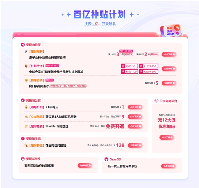 除上述福利以外,贝锐电商平台近似双12大促优惠抓续加码,全新推出的“贝锐洋葱头”和“OrayOS”也同期通达免费体验。