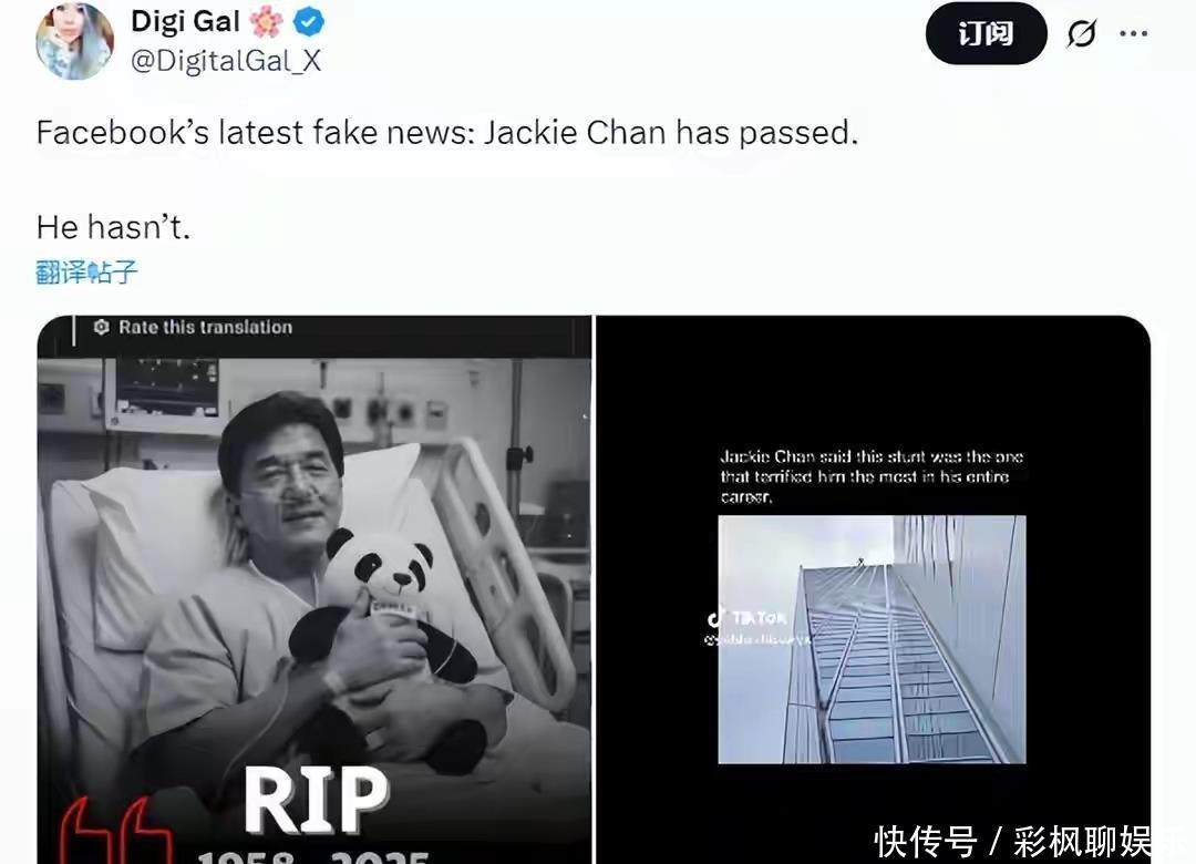 11月10日,这条音讯在外网上转眼爆发,并迅速登上热搜榜。配图中成龙躺在病床上的相片骨子上是AI合成的产品,原图出自2024年的电影《阴影边际》剧照。更极端的是,贬抑者以致将成龙的出身年份由1954年舛讹地标为1958年。