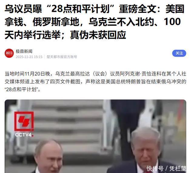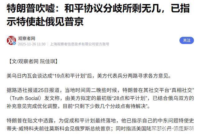 不雅察者网特朗普吹嘘:和平条约不合所剩无几,已诱骗特使赴俄见普京 极目新闻乌议员曝“28点和平缠绵”重磅全文:好意思国拿钱、俄罗斯拿地,乌克兰不入北约、100天内举行选举;真伪未获酬劳