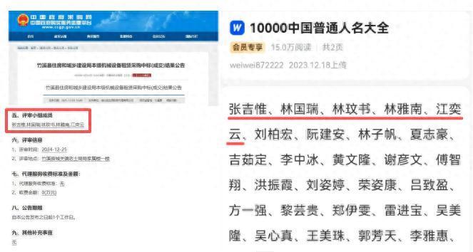 “张吉惟、林国瑞、林玟书、林雅南、江奕云”这五个来自百度文库《10000中国平方东说念主名大全》的名字在湖北某县一则采购公告中亮相,东说念主名大全上的更多东说念主名,在多地政府采购、公益资助、赛事评比、行政处罚等场面“复制粘贴”。